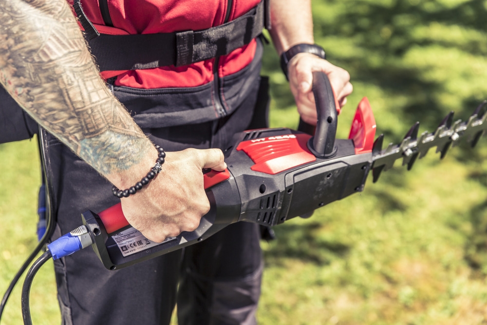 Vysoce kvalitní žací lišta s protiběžnými bezpečnostními noži o délce 45 cm a průměrem střihu až 28 mm pro precizní střih i při nasazení na větší ploše. Akumulátorové nůžky HT 4245 jsou poháněny výkonným akumulátorem řady Power Flex. Náklady na pořízení vysoce výkonného akumulátoru se velmi brzo vrátí, protože stejný akumulátor můžete použít pro celou řadu výrobků Power Flex. Podle potřeby můžete zvolit rychlost ECO-Speed nebo Power-Speed (1.200/1.500 ot/min). Hmotnost přístroje činí pouze 3,6 Kg (bez akumulátoru). Díky akumulátorovému provozu je zajištěn velký akční rádius, nezávislost an elektrické síti, bez obav z nechtěného přeseknutí přívodního kabelu. Ve spojení s dlouhou výdrží akumulátoru Power Flex – 42 V / 7,5 Ah postupuje práce rychle kupředu. Akumulétor nabízí provozní dobu až 150 min / 200 min (bez zátěže/v zátěži), doba nabíjení je ca 2,5 hodiny. Li-Ion akumulátory mají dlouhou životnost, jsou bezúdržbové, netrpí samovybíjením ani paměťovým efektem. O aktuálním stavu nabití akumulátoru Vás informuje LED kontrolka. Nízkovibrační bezuhlíkový elektromotor poslední generace spolu s vynikající ergonomií a nastavitelným držadlem (v rozsahu 90° – 0° – 90°) zajistí bezpečné ovládání přístroje v každé poloze.