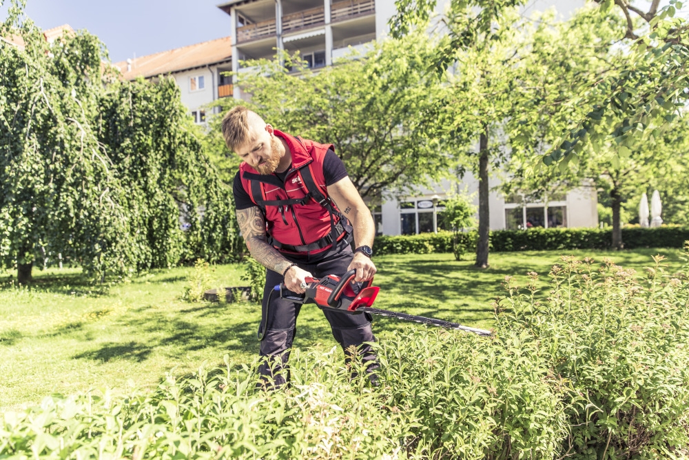 Akumulátorové nůžky na živý plot HT 4245 je možné provozovat pouze s naším zádovým popruhem s kapsou na akumulátor (Číslo výrobku: 127442). Tím zůstává velký a těžký akumulátor pohodlně na těle a nezvyšuje hmotnost přístroje.